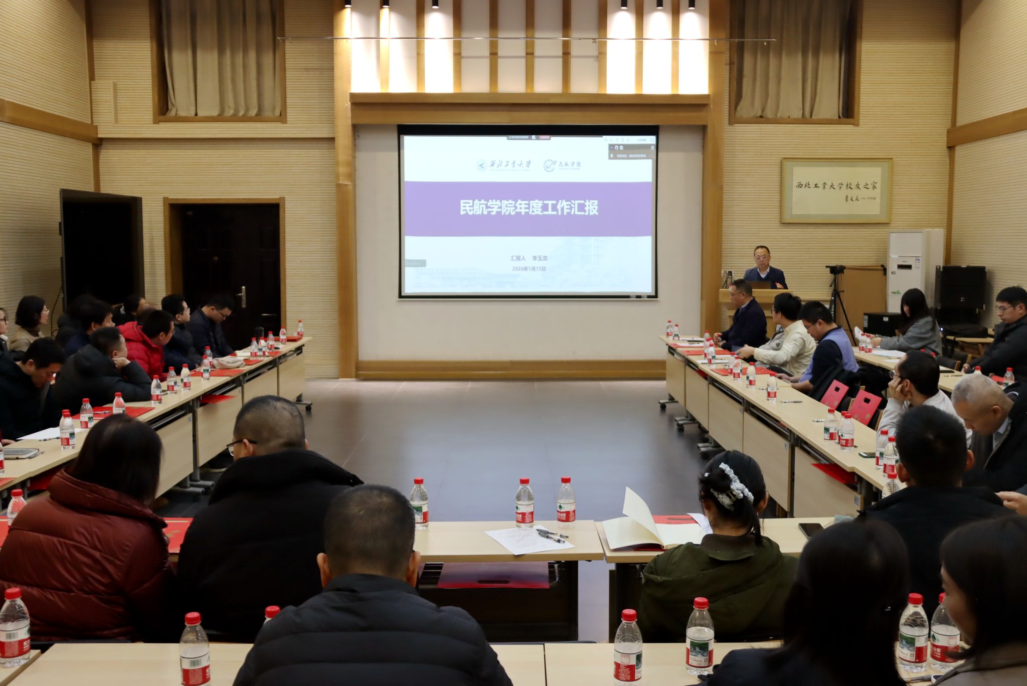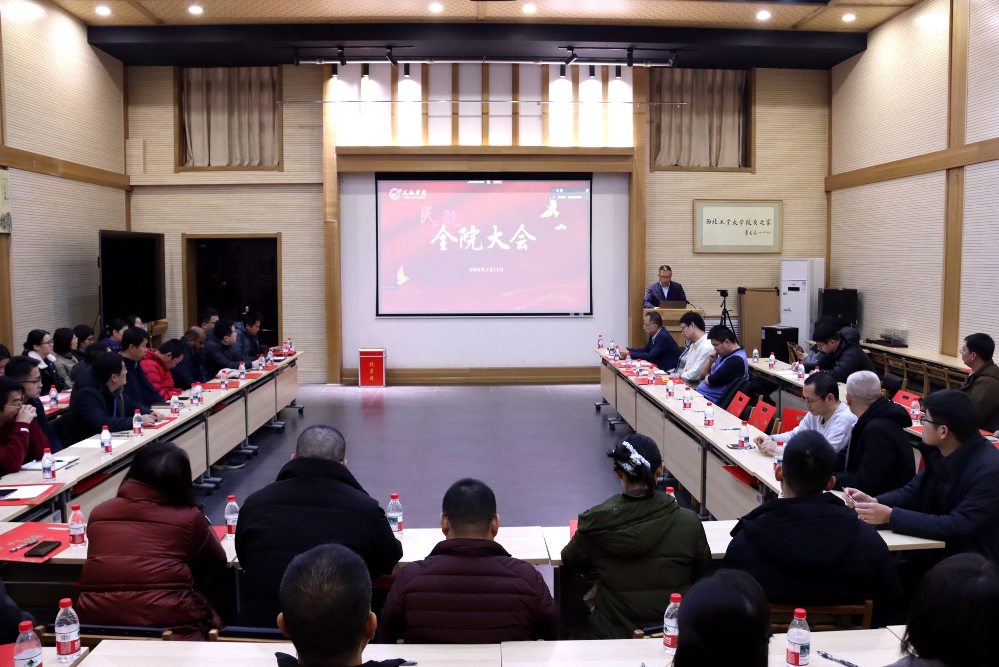 1月15日下午,民航学院2026年度全院教职工大会在西安友谊校区阶二会议室与太仓智汇港C702报告厅同步举行。学院全体教职工参加会议,会议由学院党委书记闫伟主持。