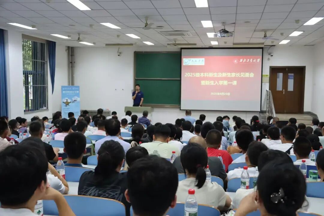 为贯彻“育人为本、德育为先”的教育方针,进一步加强家校互动,凝聚育人共识,西北工业大学民航学院于8月23日下午在长安校区教学西楼A座104教室召开了2025级本科新生及新生家长见面会暨新生入学第一课。学院党总支书记闫伟、教学大类首席马存宝教授、新生辅导员刘少华、学工主管苟旭丰以及班主任、学长代表,与本科新生和新生家长共200余人参加了本次活动。会议由学院党总支副书记张龙主持。